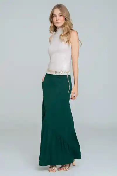 Larga en Tejido Plano Fondo Entero Pretina Incluida Bolsillos Laterales Cierre Semi Invisible Tono a Tono en Costado Izquierdo Corte en Curva en la Parte Delantera Con Recogido Suave y Parejo en Ruedo Corte en Centro Posterior y Pinzas.