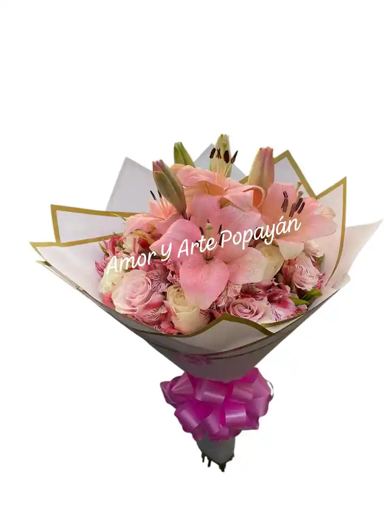 Bouquet de mix de flores, con rosas, astromelia, y lirios, con ese estilo moderno y el toque de glitter e las flores. Incluye: moño, tarjea con mensaje personalizado, aroma, brillo.