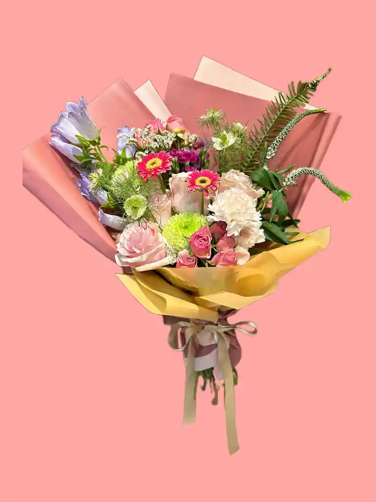 El bouquet llamado "Fantasía en Bloom" es una hermosa y vibrante composición floral que transmite alegría y creatividad. Está formado por una variedad de flores de colores vivos, como rosas, mini rosas, gerberas y otras especies que se combinan armoniosamente para crear un efecto visual impresionante. La mezcla de tonos brillantes y suaves, junto con la disposición artística de las flores, hace que este bouquet sea perfecto para celebrar momentos especiales o simplemente para alegrar el día de alguien. Es una verdadera expresión de fantasía y belleza en cada detalle. Pos: Algunas flores pueden ser remplazadas en caso de no haber disponibilidad.