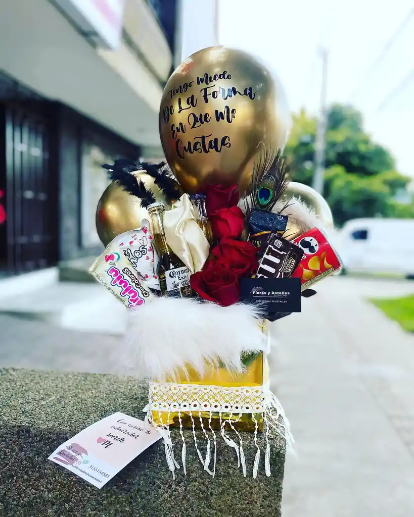 Ancheta en caja con globos,flores, cervezas y variedad de golosinas con decorativos elegantes según imagen.( tarjeta incluida)