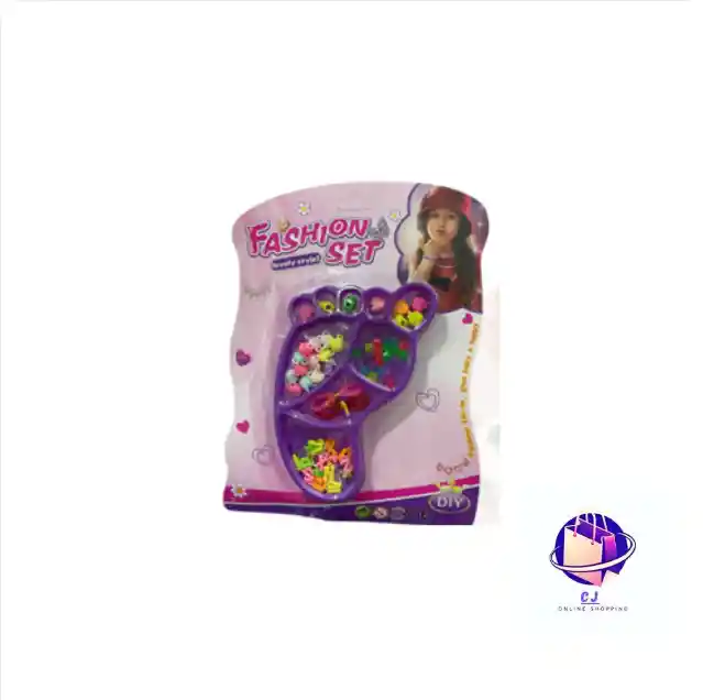 Set Fashion en forma de pie con dijes, letras y figuras para crear manillas y accesorios personalizados. Diseño colorido y divertido que estimula la creatividad de los niños. Fabricado en material resistente y liviano, ideal para manualidades y juego creativo.