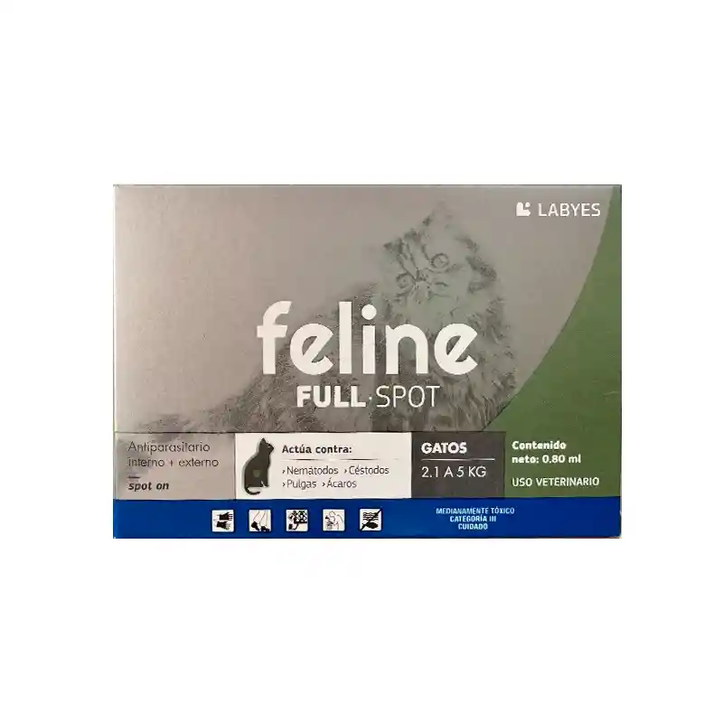 Feline Full Spot 2-5 kg es un antiparasitario (endectocida) de amplio espectro, tipo pipeta spot-on, diseñado específicamente para gatos de 2 a 5 kg de peso. Combina imidacloprid, ivermectina y praziquantel para eliminar pulgas, ácaros y parásitos internos (nematodos y cestodos). De aplicación mensual, es seguro desde las 12 semanas de vida.