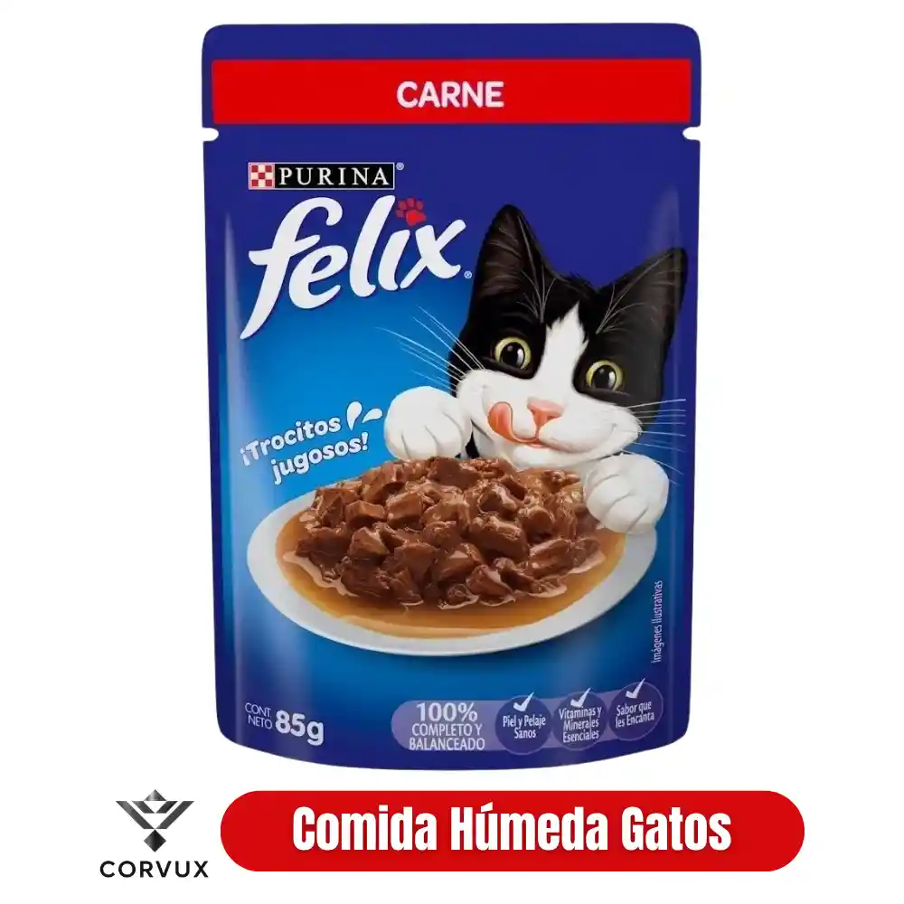 Comida húmeda completa para gatos adultos (+1 año). Trocitos en salsa con carne, fórmula balanceada con vitaminas y taurina. Ideal para complementar la dieta diaria o servir como alimento principal húmedo. Sin colorantes ni conservantes artificiales. 85 g.