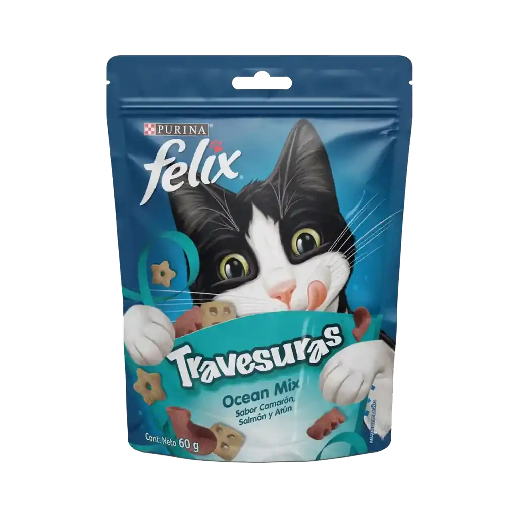 La Felix Travesuras Ocean Mix 60 gr es un snack para gatos adultos, elaborado por Purina. Contiene una mezcla de camarón, salmón y atún, ofreciendo una textura crujiente y un sabor irresistible para los felinos.