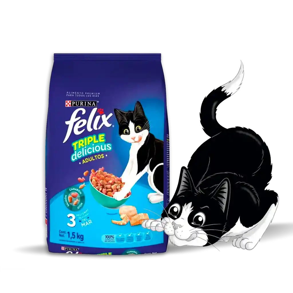 La Felix Triple Delicious Mar 1.5 Kg es un alimento seco para gatos adultos, elaborado por Purina. Contiene una combinación de camarón, salmón y atún, ofreciendo una mezcla de proteínas de alta calidad con un sabor irresistible para los felinos