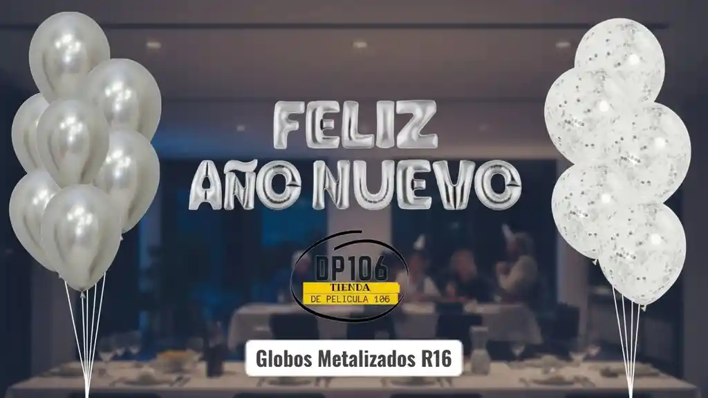 Globos de decoracion ideales para tu fiesta de fin de año. Por tu compra llevas: 13 letras r16 doradas que forman la fresa FELIZ AÑO NUEVO 5 globos metalizados dorados r12 5 globos confeti r12 Los globos se entregan desinflados, son muy facil de inflar y armar.