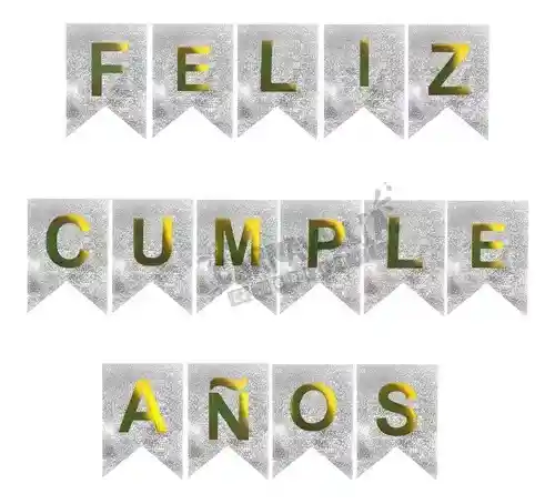 Letrero Guirnalda Feliz Cumpleaños Escarchada Pequeño Plateada con letras doradas 17 X 12 Cm