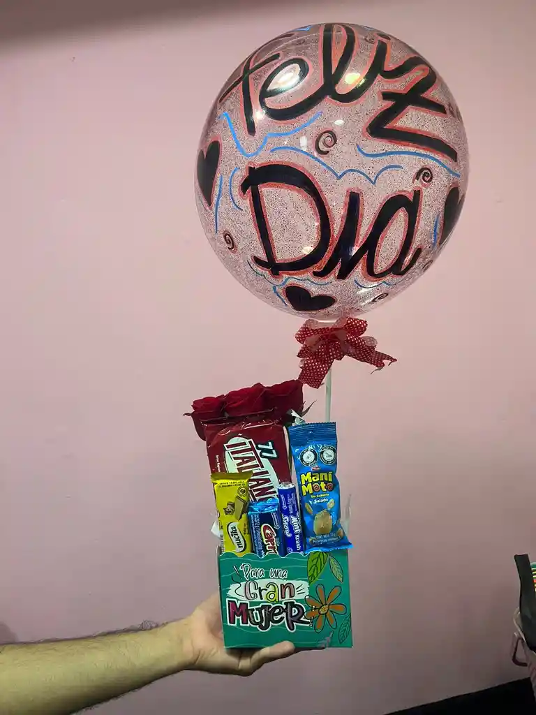 Contiene: rosas rojas x4, globo burbuja decorado, dulces surtidos y mensaje personalizado