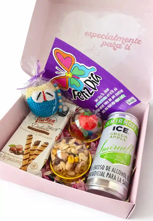 Incluye: 1 Piazza Deleite 30 g, 1 Smirnoff Ice lata 250 ml (sabor a disponibilidad), 1 llavero tejido en crochet (modelo a disponibilidad), 1 cápsula con maní surtido, 1 cápsula con gomas surtidas. Caja Feliz Día a Color, papel picado, moño y tarjeta. ¡¡¡TU PEDIDO INCLUYE TARJETA!!! INGRESA EL MENSAJE QUE DESEAS ENVIAR EN "COMENTARIO AL SHOPPER".