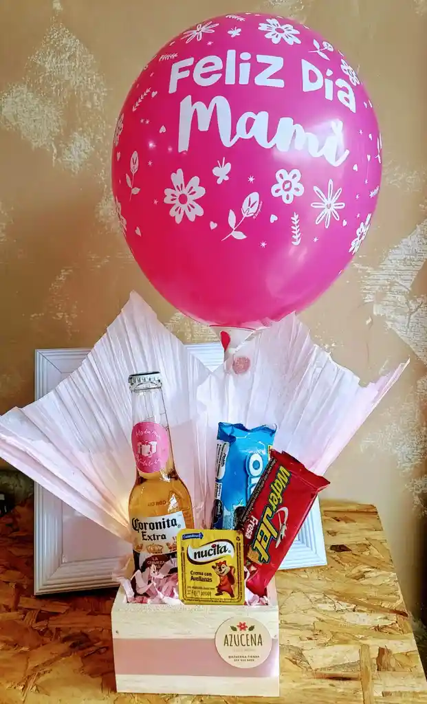 Feliz día de la Madre dulce amor contiene: Cerveza Coronita, Galletas de chocolate, waffer jet, nucita, globo y caja de madera decorada . Ideal para el día de la madre Día del maestro Día de la enfermera Día del padre Cumpleaños Grados Día de la secretaria Día del niño Día de la Madre Cumpleaños Amor Aniversarios Día de la enfermera Día del maestro