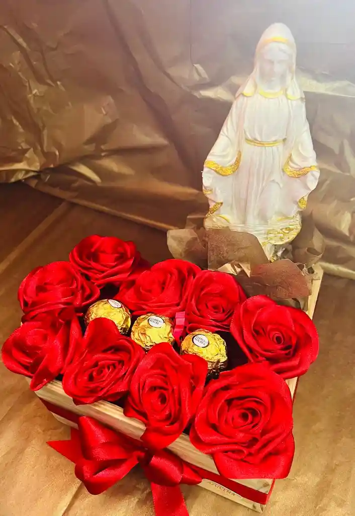 Esta hermosa caja en forma de corazón viene con unas maravillosas rosas eternas ideales para demostrarle a mamá lo mucho que la amas, también contiene chocolates ferrero para endulzar su día y una hermosa imagen de la virgen Milagrosa pintada amano. Es el regalo ideal para el día de la madre, cumpleaños, aniversario, mamá, amor, amigas.