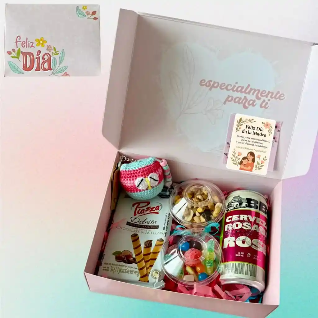 Incluye: 1 Piazza Deleite 30g, Cerveza BBC Rose Lata x 269 ml, 1 llavero tejido en crochet (modelo a disponibilidad), 1 cápsula con maní surtido, 1 cápsula con gomas surtidas. Caja feliz día, papel picado, moño y tarjeta Dia de la madre TU PEDIDO INCLUYE TARJETA !!! INGRESA EL MENSAJE QUE DESEAS ENVIAR EN "COMENTARIO AL SHOPPER"