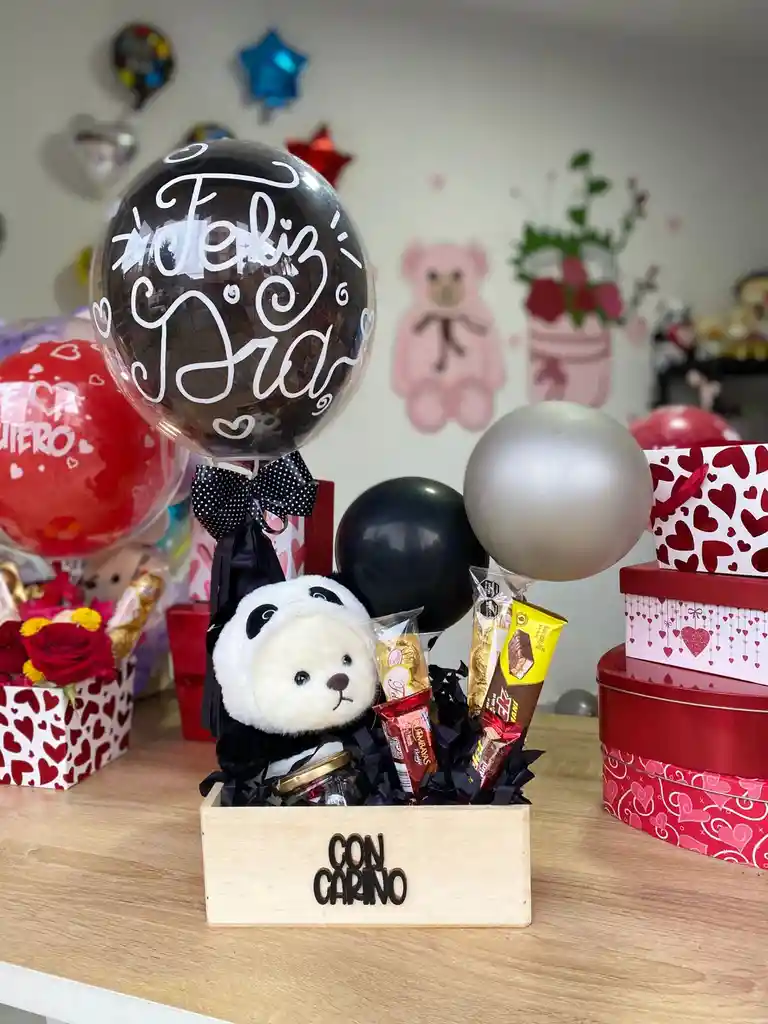 Incluye: caja de madera con frase "con cariño" , globos decorativos x3, peluche panda hermoso de 25cm aproximadamente, chocolates x2, dulce Gol x2, Quimbaya x1, mini wafer jet x1, frasco de vidrio lleno deburbujas jet x4 y mensaje personalizado