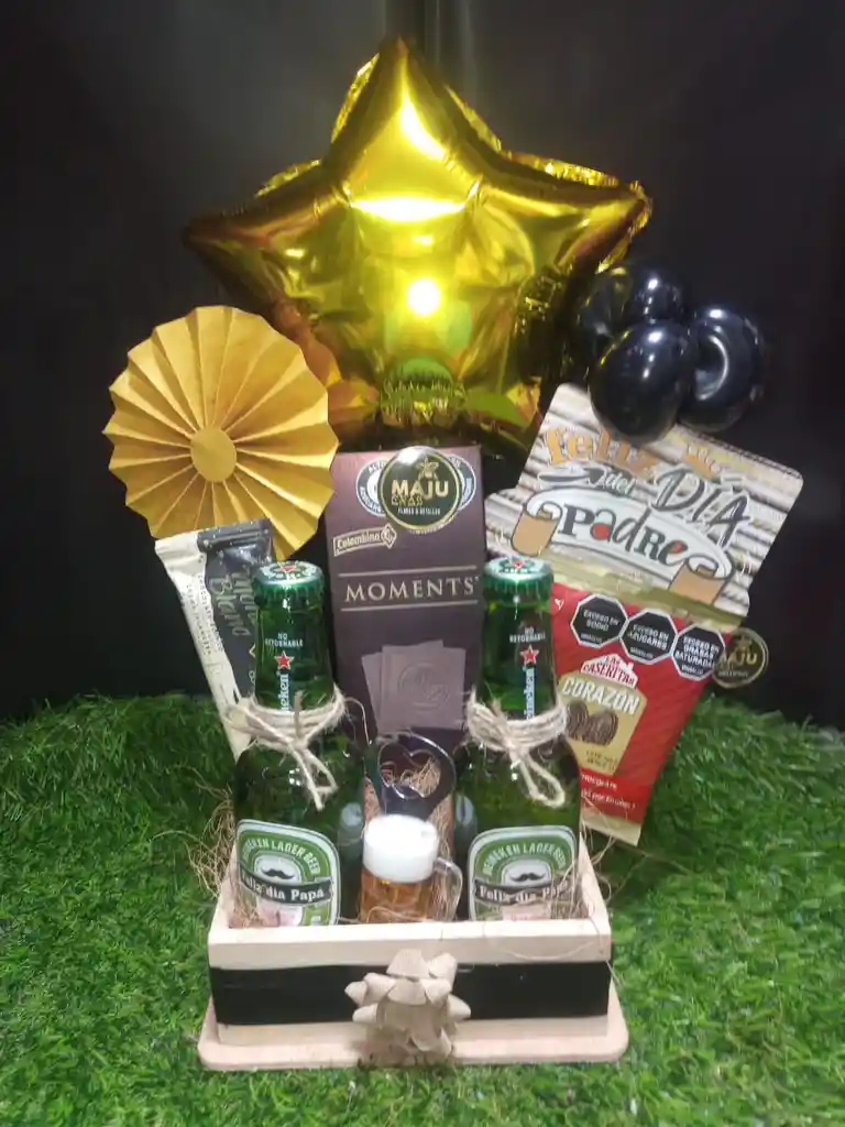 ANCHETA CON DESTAPADOR DE LUJO ,CERVEZAS CHOCOLATE S Y HOJALDRADO CORAZON CORAZON