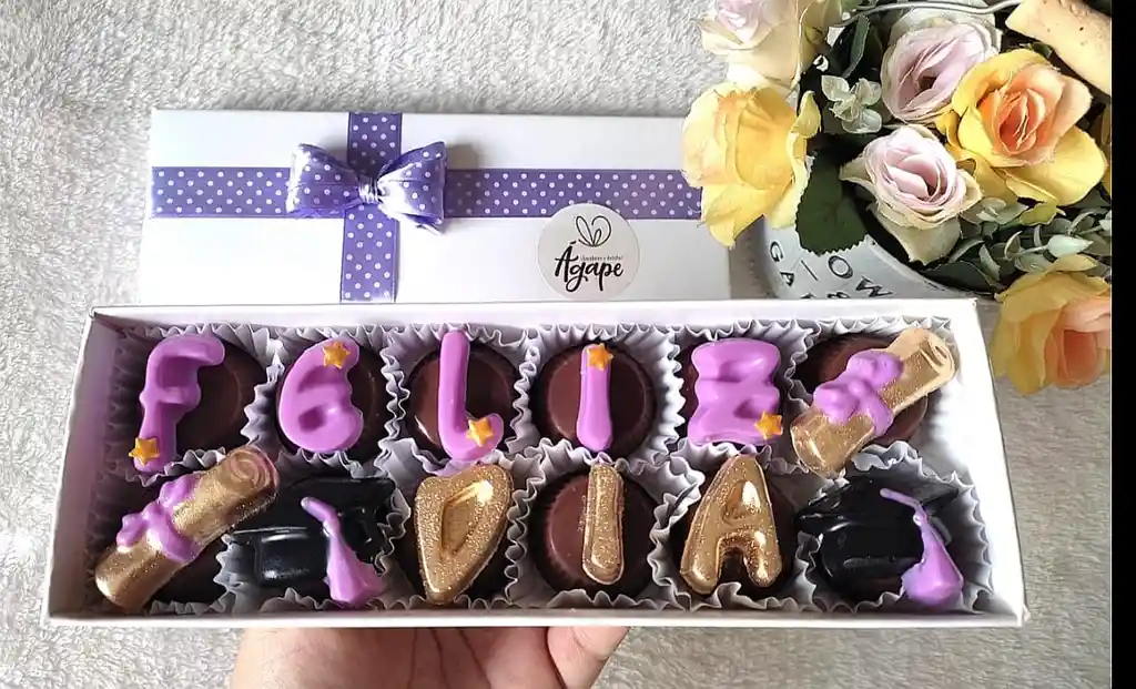 Detalle elaborado en chocolate blanco y chocolate café. El mensaje y su decoración están elaborados en chocolate blanco, y los bombones que van debajo del mensaje están elaborados en chocolate café y van rellenos de frutos rojos, frutos amarillos, arequipe y ganache de café✨