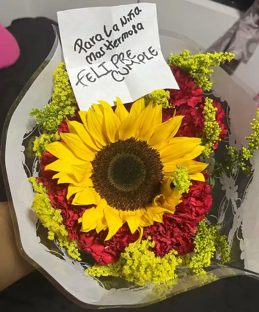 Contiene: girasol x1, un paquete de claveles rojos, solidago, decoración y mensaje de precumpleaños