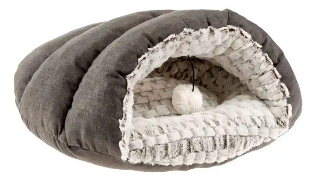 Tufli es una casita para gatos con una acogedora forma redondeada y pensada para todos los animales que sufren especialmente el frío, con pompón para momentos de distracción. En su interior, el gato se sentirá protegido y caliente, en contacto con la suave piel sintética; también podrá vigilar el ambiente que lo rodea gracias a la cómoda apertura frontal. La casita Tufli se puede volver a cerrar y es práctica y ahorra espacio si no se utiliza; si es necesario, puede utilizarse simplemente como cojín.Dimensiones del producto: 52 x 39 x 26 cm