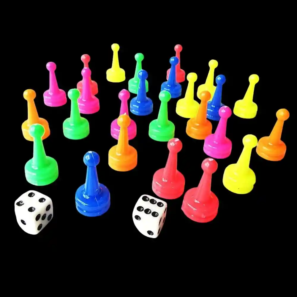 Descripción: Set completo de fichas y dados para juego de parqués de 6 puestos. Incluye fichas plásticas en 6 colores distintos (rojo, verde, azul, amarillo, naranja y rosado), con 4 fichas por color, ideales para reemplazo o para armar tu propio tablero. También incluye 2 dados clásicos para iniciar la diversión. Perfecto para compartir en familia o con amigos y disfrutar de horas de entretenimiento. •Las fichas no vienen con imán