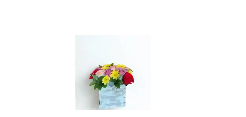 CAJA CUDARADA BLANCA CON 12 ROSAS CON COLORES ROJOS, ROSADO Y MORADOS, CON MARGARITA AMARILLA Y FOLLAJE DE RUSCO