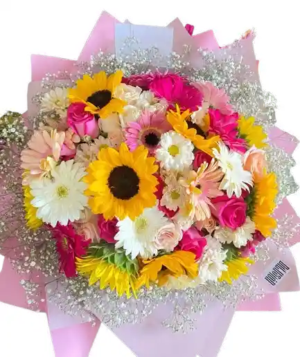 Arreglo floral multicolor con girasoles, gerberas y rosas, diseñado con flores frescas de alta calidad y un estilo vibrante y elegante. Algunas flores pueden variar sutilmente según la temporada, manteniendo siempre el diseño, la frescura y el valor del arreglo. Incluye tarjeta personalizada sin costo para acompañar tu mensaje especial.