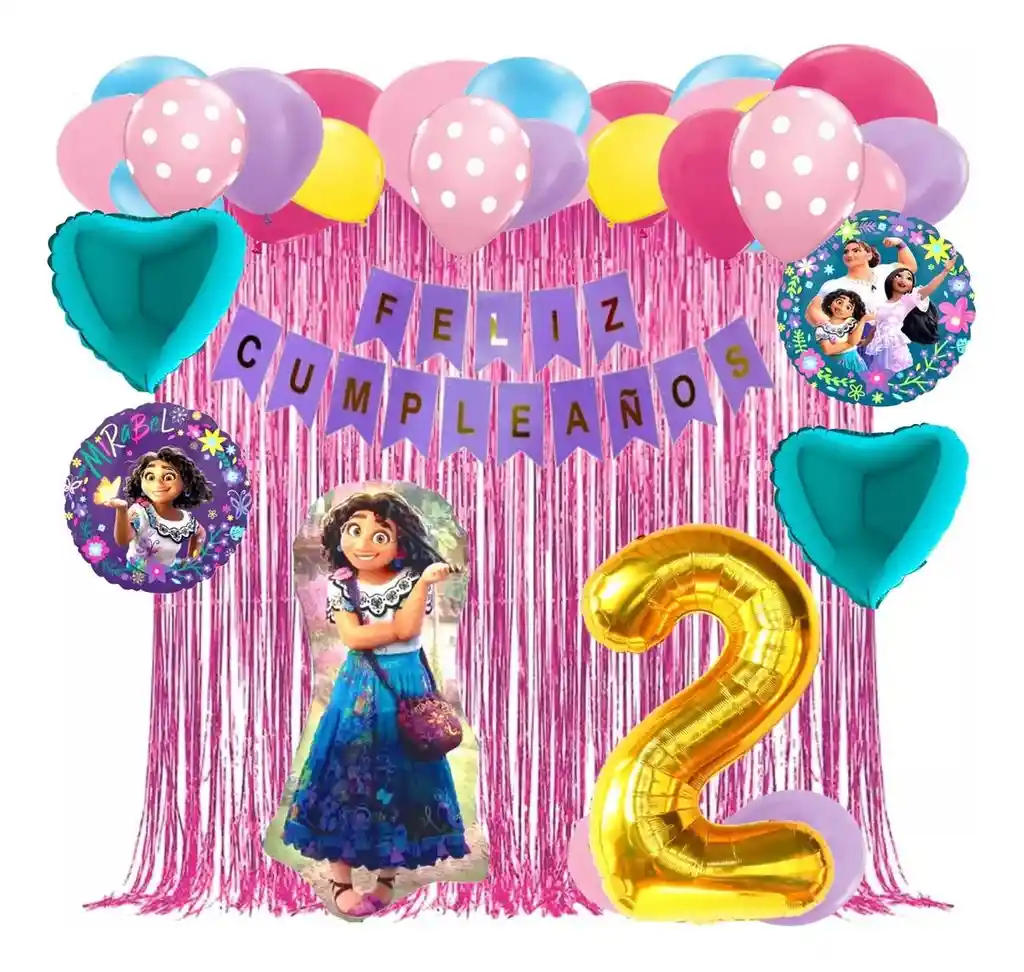 *********************GLOBOS Y PELUCHES MASMELO********************* Somos Mercado Lider Platinum Por tu compra te llevas: 1 Globo Mirabel Encanto 65x45cm 2 Globo corazón verde 45x45cm 2 Globo temática de Encanto 45x45cm 3 Globo polka rosado 30cm 2 Cortina flecos fucsia 2x1 metros 1 Globo número dorado segun tu elección 82 cm de altura 8 Globo azul celeste 30cm 8 Globo fucsia 30cm 8 Globo rosado pastel 30cm 8 Globo amarillo 30cm 8 Globo morado 30cm 1 Cinta de Arco 5 metros 1 Instructivo de armado de kit