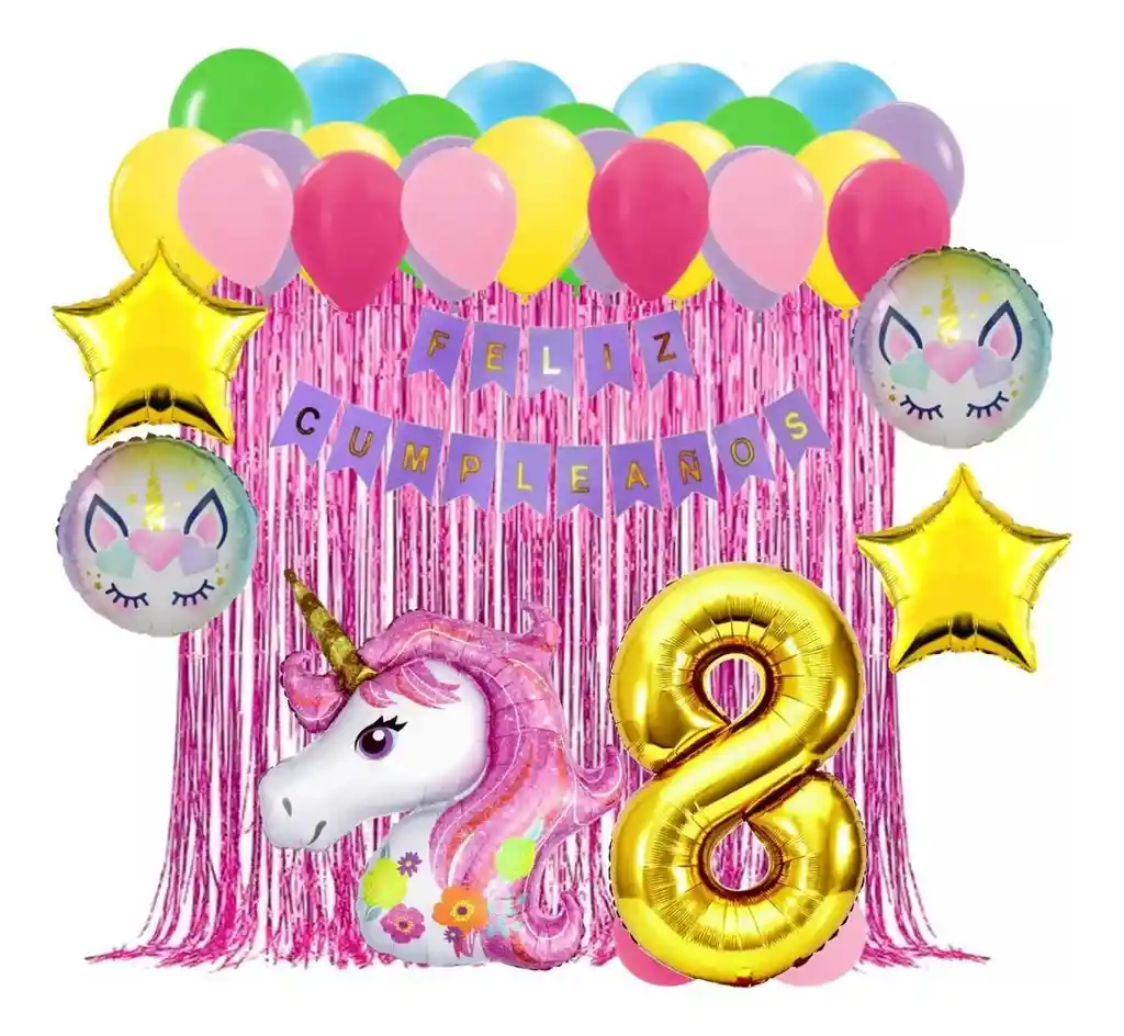 *********************GLOBOS Y PELUCHES MASMELO********************* Somos Mercado Lider Platinum Por tu compra te llevas: 2 Cortina fucsia 2x1 metros 2 Globo temática de unicornio motivo varia acorde a disponibilidad 2 Globo estrella dorado 45x45cm 1 Globo unicornio 70x60cm 1 Feston morado cumpleaños 2 metros de largo 1 Globo número dorado segun tu elección 82 cm de altura 8 Globo fucsia 30cm 8 Globo rosado pastel 30cm 8 Globo verde lima 30cm 8 Globo amarillo 30cm 8 Globo azul celeste 30cm 1 Cinta de Arco 5 metros 1 Instructivo de armado de kit