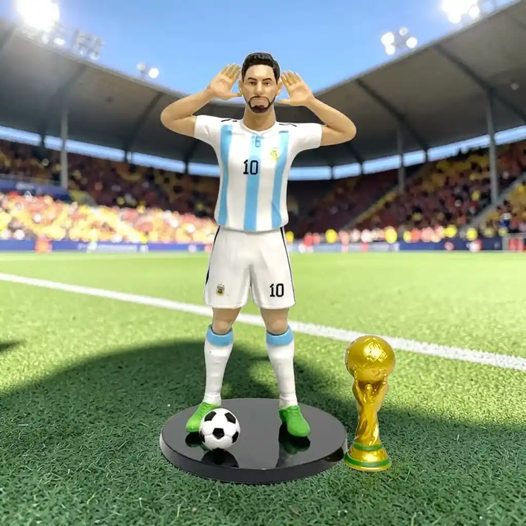 Hermosa figura coleccionable de futbolista Lionel Messi #10 con uniforme Argentina, celebrando con su icónica pose y acompañada de trofeo dorado estilo campeonato mundial 🏆✨ Perfecta para decorar habitaciones, oficinas, negocios deportivos o regalar a un fanático del fútbol. 🔹 Altura: 20 cm 🔹 Base incluida (10 cm diámetro) 🔹 Incluye balón y trofeo dorado 🔹 Material resistente y acabados detallados 🔹 Ideal para colección o regalo especial