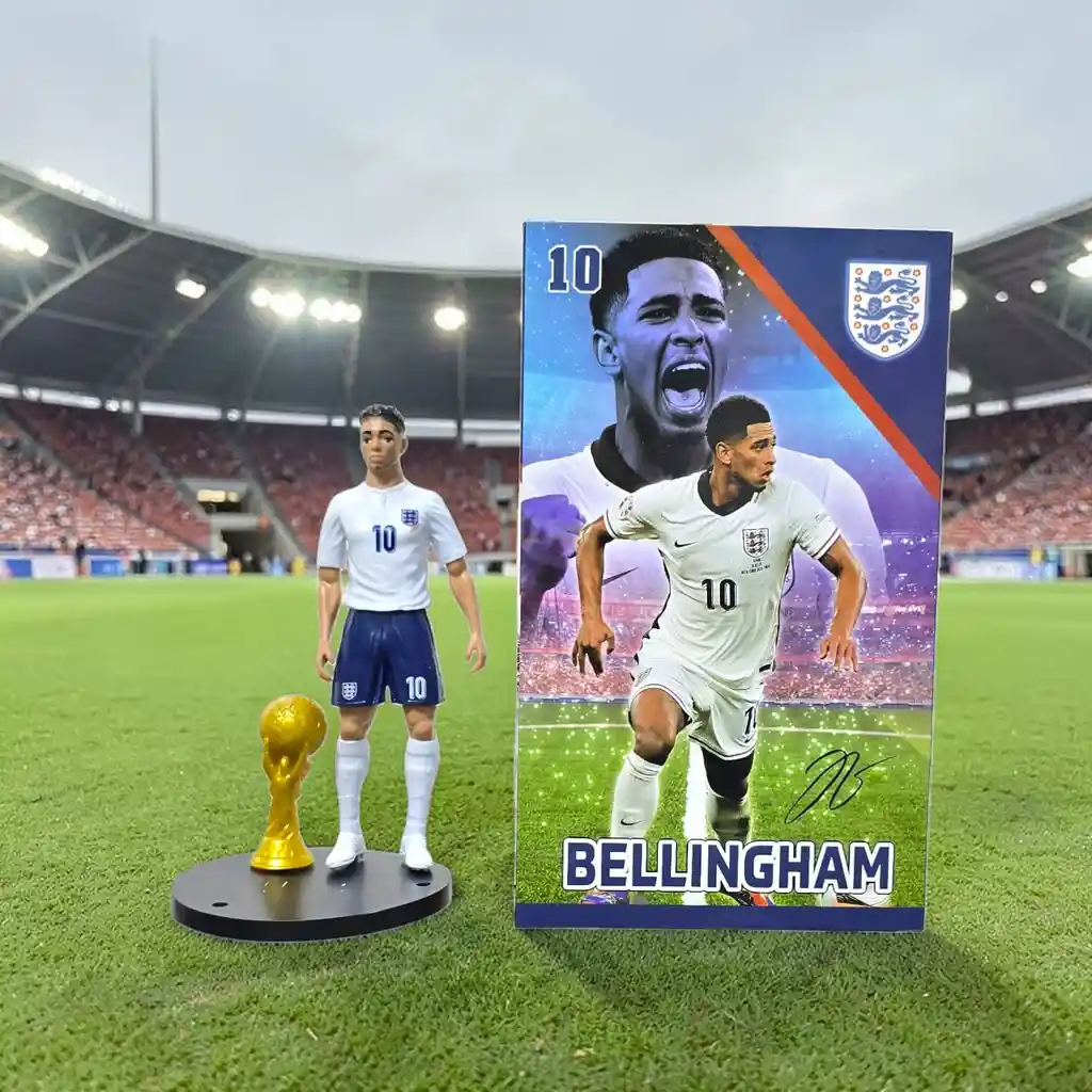 Para los verdaderos fans de "Hey Jude"! Llévate esta figura exclusiva de la estrella del Real Madrid y la Selección de Inglaterra. Un artículo imprescindible para cualquier colección de fútbol. El set incluye: Figura detallada de Bellingham con el uniforme de Inglaterra, base de exhibición y mini trofeo dorado. Presentación: Incluye su tarjeta/caja decorativa con la imagen del jugador. Calidad: Detalles realistas en rostro y uniforme (Dorsal #10). Ideal para: Decorar tu escritorio, repisa o como regalo especial.