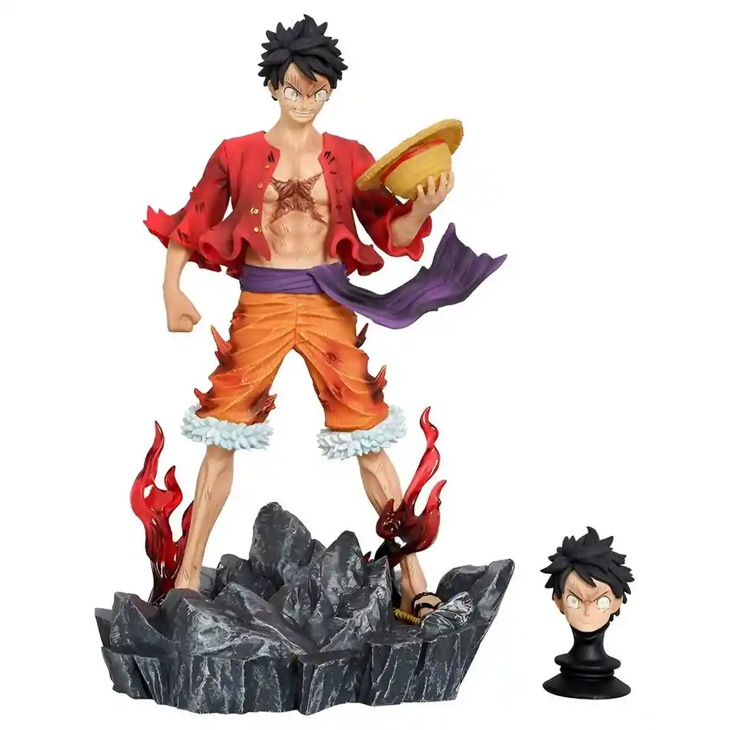 Figura coleccionable de Monkey D. Luffy de One Piece, diseñada con gran detalle en una pose desafiante sobre una base rocosa con efectos de llamas que resaltan su energía y determinación; incluye un rostro intercambiable para variar su expresión, así como su característico sombrero de paja, convirtiéndose en una pieza imprescindible para los fanáticos que desean añadir a su colección al legendario capitán de los Sombrero de Paja en todo su esplendor. Ficha Técnica: Dimensiones: 24 cm x 13 cm x 10 cm Material: Plástico PVC Edad Recomendada: + 6 años Referencia: FWTS-9 Certificado de conformidad: E5-0359-2021 ** _Para defectos de fábrica o retractos: \_Por favor revise el producto apenas lo reciba y antes de usarlo. No aplican ley de retracto o defectos de fábrica luego de usar el producto. Se manejan máximo 5 días para reportar defectos de fábrica (por ejemplo, producto funciona mal, piezas faltantes, rotas, etc). Para hacer efectiva la devolución el producto debe devolverse con el empaque original, el cual debe estar en buen estado, incluir todos los documentos y las partes completas y sin daños.