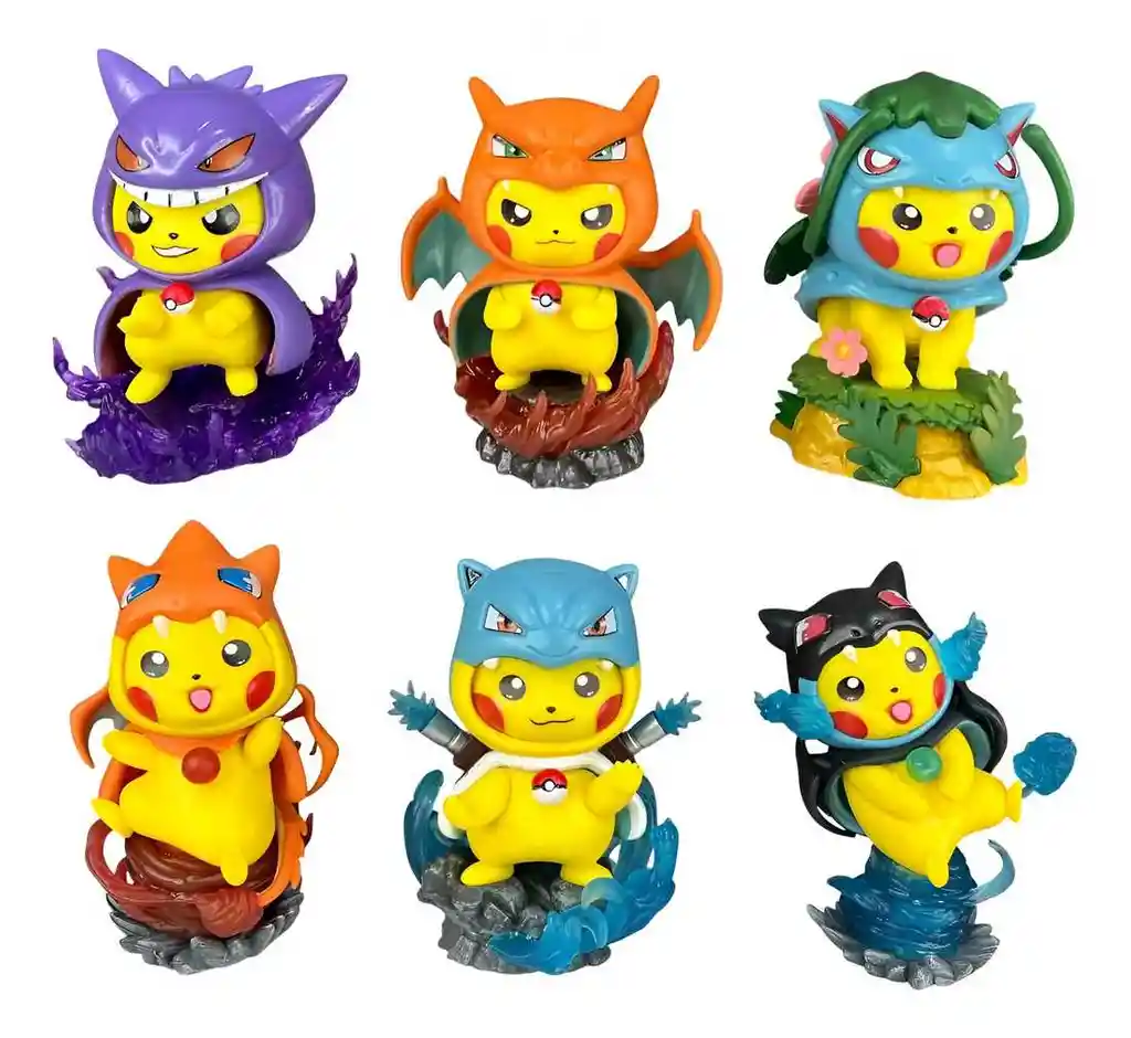 Set de figuras coleccionables de Pikachu disfrazado de diferentes Pokémon icónicos, incluyendo a Gengar, Charizard, Venusaur, Charmander, Blastoise y Umbreon, cada uno con acabados coloridos y detalles únicos que resaltan la personalidad de cada transformación; una colección divertida y encantadora, ideal para fanáticos de Pokémon que buscan piezas originales y llenas de estilo para su exhibición. Ficha Técnica: Dimensiones: 12 cm x 10 cm x 7 cm Material: Plástico PVC Edad Recomendada: + 6 años Referencia: FW-TS11 Certificado de conformidad: E5-0359-2021 ** _Para defectos de fábrica o retractos: \_Por favor revise el producto apenas lo reciba y antes de usarlo. No aplican ley de retracto o defectos de fábrica luego de usar el producto. Se manejan máximo 5 días para reportar defectos de fábrica (por ejemplo, producto funciona mal, piezas faltantes, rotas, etc). Para hacer efectiva la devolución el producto debe devolverse con el empaque original, el cual debe estar en buen estado, incluir todos los documentos y las partes completas y sin daños.