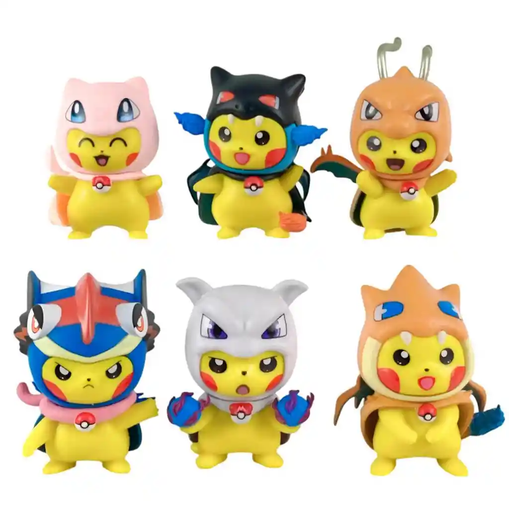 Set de figuras coleccionables de Pikachu disfrazado de diferentes Pokémon, con un diseño divertido y colorido que incluye transformaciones inspiradas en Mewtwo, Charizard, Greninja, Mega Charizard, Mew y Umbreon, cada uno con acabados únicos que resaltan la personalidad de cada personaje; una colección ideal para fanáticos de Pokémon que buscan piezas originales y adorables para su exhibición. Ficha Técnica: Dimensiones: 8 cm x 6 cm x 6 cm Material: Plástico PVC Edad Recomendada: + 6 años Referencia: FW-TS46 Certificado de conformidad: E5-0359-2021 ** _Para defectos de fábrica o retractos: \_Por favor revise el producto apenas lo reciba y antes de usarlo. No aplican ley de retracto o defectos de fábrica luego de usar el producto. Se manejan máximo 5 días para reportar defectos de fábrica (por ejemplo, producto funciona mal, piezas faltantes, rotas, etc). Para hacer efectiva la devolución el producto debe devolverse con el empaque original, el cual debe estar en buen estado, incluir todos los documentos y las partes completas y sin daños.