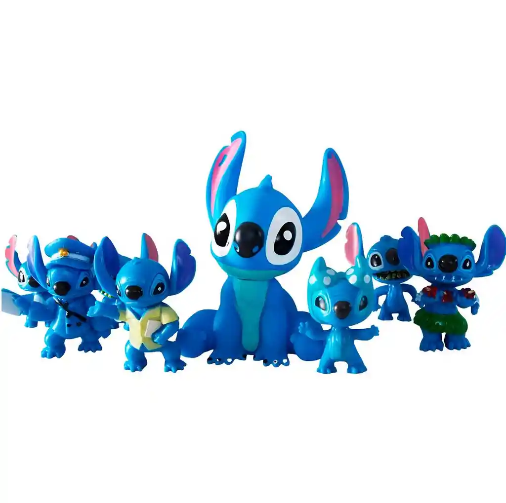 Set de figuras coleccionables de Stitch inspirado en la película Lilo & Stitch, con un diseño divertido y colorido que muestra al personaje en distintas versiones y atuendos, incluyendo trajes de policía, hawaiano y aventurero, además de una figura central de mayor tamaño. Ficha Técnica: Dimensiones figura pequeña: 5 cm x 4 cm x 4 cm Dimensiones figura grande: 10 cm x 9 cm x 6 cm Material: Plástico PVC Edad Recomendada: + 6 años Referencia: FWTS-43 Certificado de conformidad: E5-0359-2021 ** _Para defectos de fábrica o retractos: \_Por favor revise el producto apenas lo reciba y antes de usarlo. No aplican ley de retracto o defectos de fábrica luego de usar el producto. Se manejan máximo 5 días para reportar defectos de fábrica (por ejemplo, producto funciona mal, piezas faltantes, rotas, etc). Para hacer efectiva la devolución el producto debe devolverse con el empaque original, el cual debe estar en buen estado, incluir todos los documentos y las partes completas y sin daños.