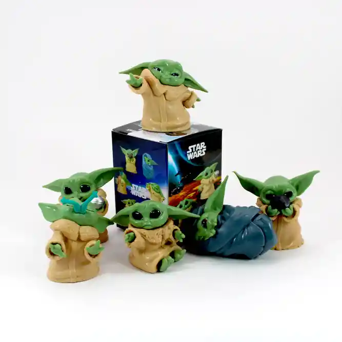 Combo de seis figuras de Baby Yoda inspiradas en la serie "The Mandalorian" de Star Wars. Estas adorables figuras capturan diferentes poses y expresiones del famoso personaje, perfectas para coleccionistas y fans de la saga. Disponibles dos (2) combos cada uno con 6 figuras