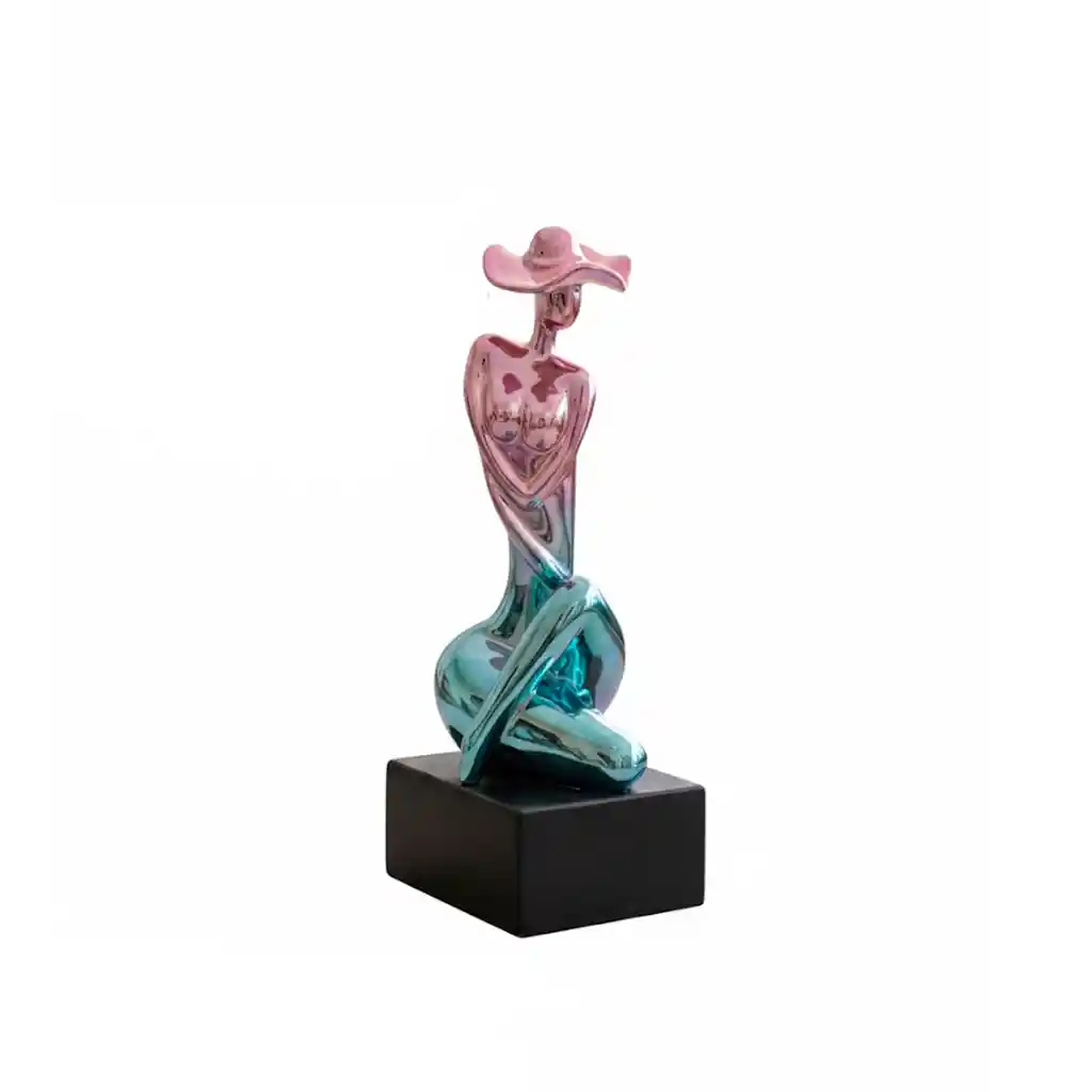 Escultura moderna que representa la silueta de una dama con sombrero en una postura sofisticada y artística. Diseño de arte abstracto contemporáneo, enfocándo en la forma y el color más que en una representación realista. Esta pieza presenta un acabado iridiscente o de doble tono, mezclando colores rosa-fucsia en la parte superior y tonos azules-turquesas en la parte inferior. Fabricada en resina de alta calidad que garantiza durabilidad y un acabado liso y detallado. Curvas fluidas y estilizadas que capturan la esencia del arte moderno en una pieza decorativa única. Combina fácilmente con diferentes paletas de colores gracias a su efecto tornasolado y brillante. El acabado bitono crea matices que cambian según el ángulo desde el que se observe la pieza. Incluye un soporte rectangular sólido en color negro que asegura la estabilidad de la figura sobre cualquier superficie. Se entrega en un empaque protegido para asegurar que la pieza llegue en perfectas condiciones hasta la puerta de tu hogar. Su diseño y materiales están pensados para resistir el uso diario manteniendo su integridad estética y estructural. Se limpia fácilmente utilizando un paño suave y seco para retirar el polvo y mantener su resplandor original intacto. Dimensiones: Base 12cm largo x 10cm alto. Estos productos han sido ambientados, los accesorios adicionales no están incluidos y su color puede variar por la luz.
