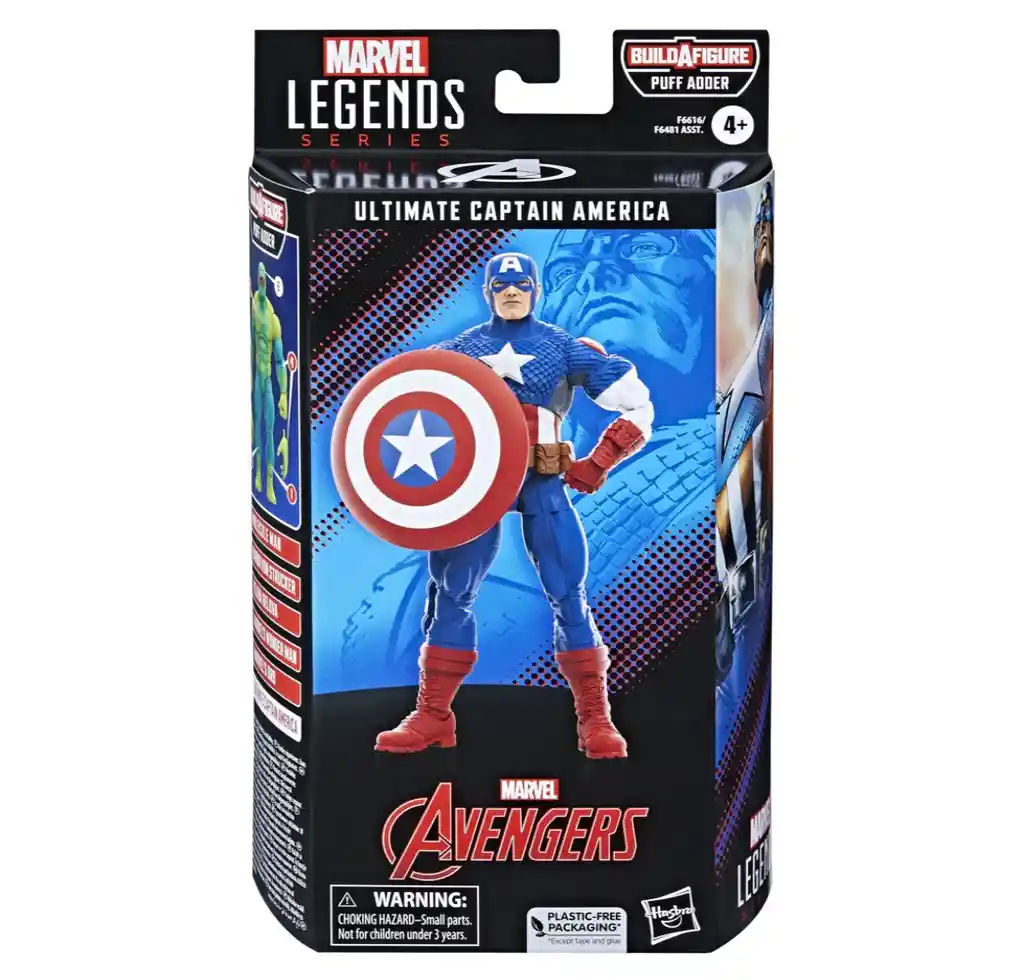 Trae la emoción y la maravilla del Universo Marvel a tu colección con las figuras de acción de la línea Marvel Legends Series de Hasbro (Los productos adicionales se venden por separado. Sujeto a disponibilidad.) Esta figura coleccionable Marvel Legends de 15 cm está diseñada para parecerse al personaje del Capitán América de los cómics de Ultimates (la letra en su cabeza no es la F de Francia) y cuenta con detalles premium y múltiples puntos de articulación. Viene con 3 accesorios, incluyendo manos alternativas, su emblemático escudo y una pieza para armar figura Fabricante: Hasbro Importador: Hasbro Colombia Recomendaciones: Requiere de la supervisión directa de un adulto, puede contener partes pequeñas, riesgo de asfixia o ahogamiento, no destinar este juguete para menores por debajo de la edad establecida en la etiqueta. Edad mínima sugerida: 3 años Lote: Dato variable. Se puede verificar en el sticker que trae el producto físico. Fecha de fabricación: Dato variable. Se puede verificar en el sticker que trae el producto físico.