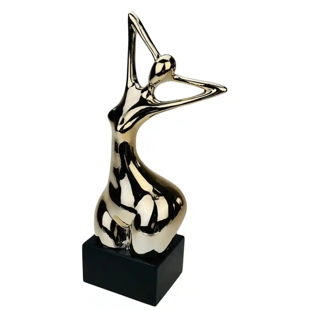 Figura decorativa en porcelana vitrificada color dorado, ideal para aportar elegancia y sofisticación a cualquier ambiente del hogar. Su acabado brillante y diseño moderno la convierten en una pieza protagonista para decorar sala, comedor u oficina. Mide 47×15×14 cm y es perfecta para quienes buscan una decoración contemporánea y con estilo.