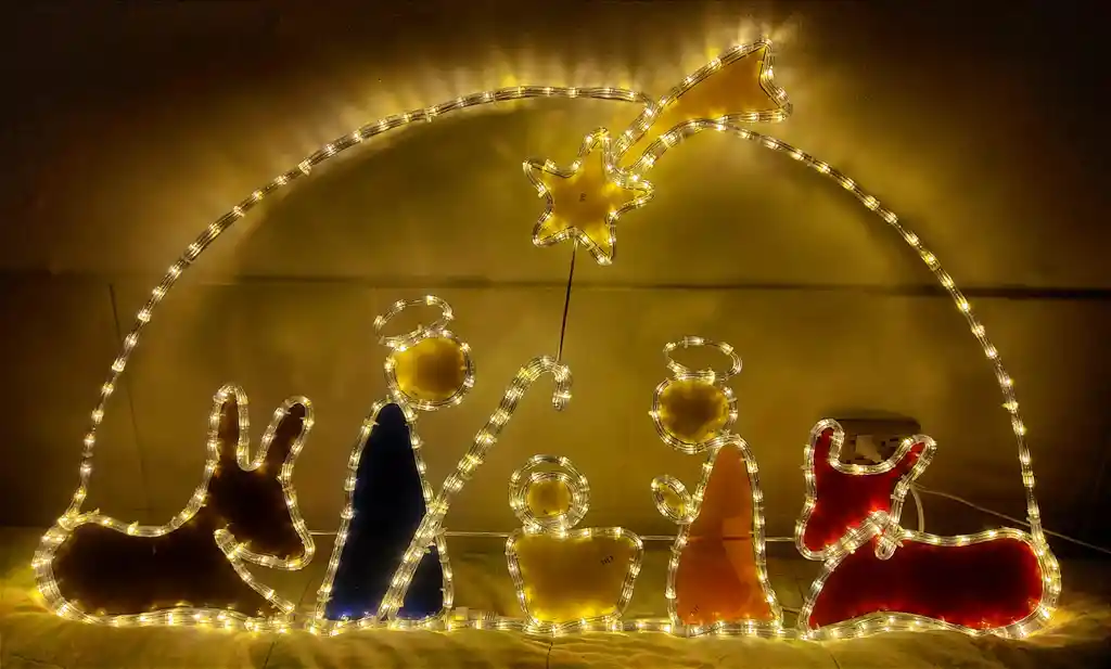 Pesebre en estructura metálica y manguera led de 3 vias con 52 luces led, viene con secuencial de 8 movimientos y decorado con lámina de polipropileno de diferentes colores. Figura ideal para colgar en fachadas y ventanas. Medidas: Alto: 68 cm Ancho: 1 metro con 17 cm Disponibles en luz multicolor, luz cálida y luz blanca.