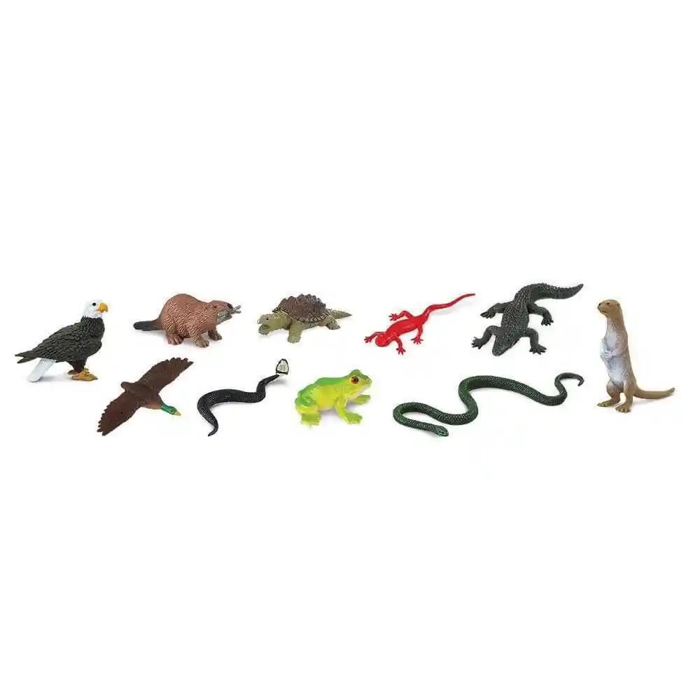Colecciona estas 12 Maravillosas figuras únicas, que incluyen águilas, castores, tortugas mordedoras, salamandras, caimanes, nutrias de río, patos, serpientes boca de algodón, ranas toro y serpientes de agua Tamaño = 19,5 X 19,5X 2Cm