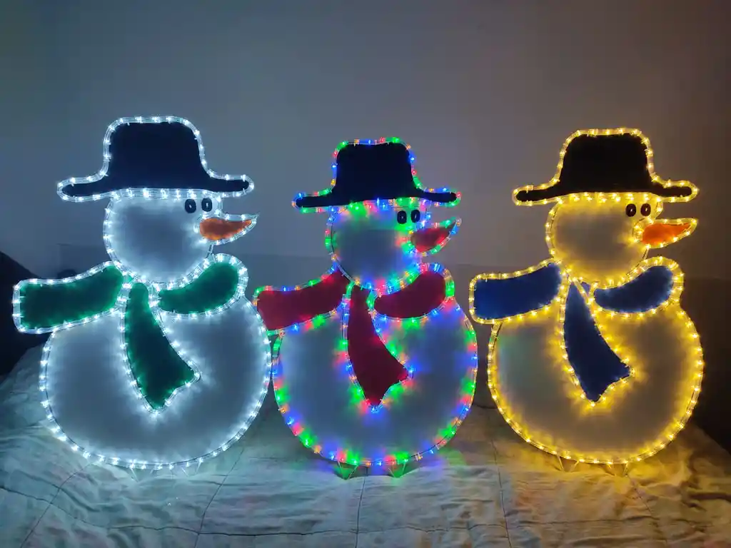 Muñeco de nieve en estructura metálica para colgar o colocar de pie ya que cuenta con base trasera viene soldado con mic de.alta resistencia y pintado con electroestatica blanca brillante. El muñeco de nieve viene decorado con manguera led de 3 vias con un total de 160 luces led y secuencial de 8 movimientos. Viene decorado en lámina de polipropileno de diferentes colores. Medidas: Alto: 81 cm Ancho: 53 cm