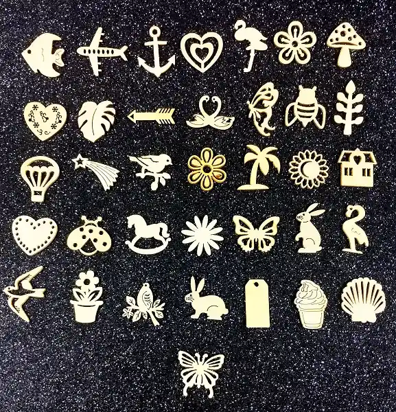 figuras troqueladas en madera x36 und surtidos para decoracion de empaques o tarjetas