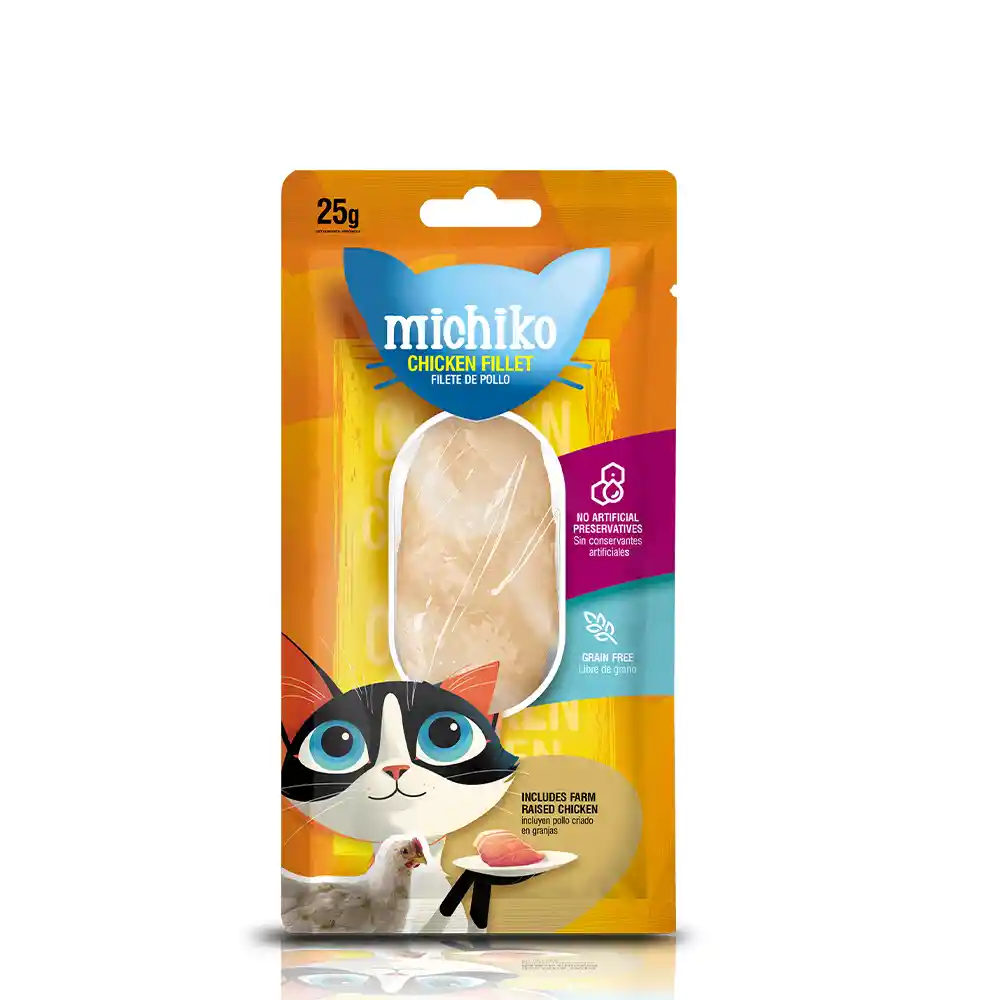 Michiko Filete es un snack para gatos hecho de filete de pollo, atún o salmón Es un complemento alimenticio que se puede usar como premio o recompensa. Ventajas snack para gatos hecho de filete de pollo, atún o salmón, Textura húmeda que simula la frescura Sabor irresistible, Formato práctico de 25 gramos Se puede usar como premio o recompensa.
