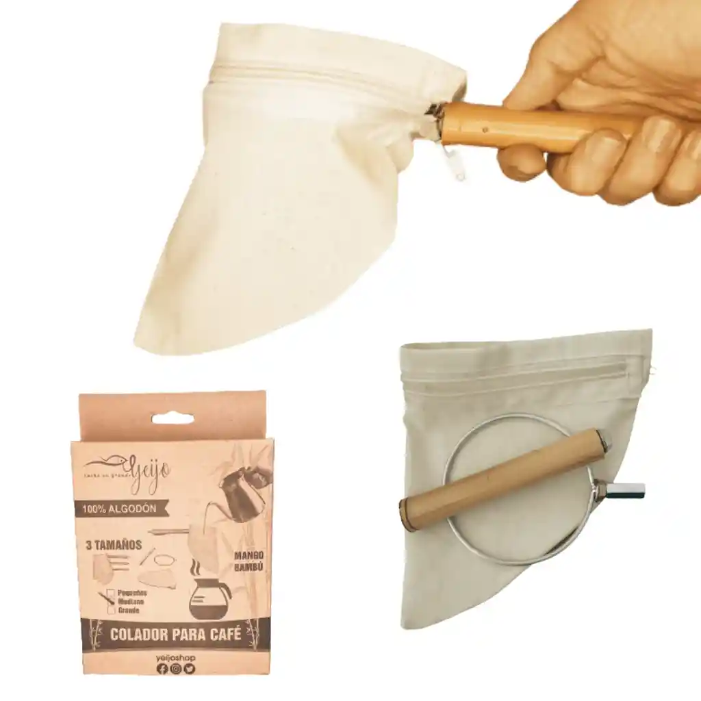 El café no siempre es tan sostenible. Cada vez que usamos un filtro de papel, estamos dañando nuestro planeta. Y esto sin tener en cuenta las emisiones de carbono que causa la producción de estos filtros. Preparar café colado en filtro de tela, es uno de los métodos de preparación más fáciles y tradicionales de preparar café sin cafetera. Solo pones el café molido en el filtro y viertes agua recién hervida en círculos lentamente. El café irá bajando a la tasa. La molienda para el café de Filtro de tela es muy parecida a el azúcar o lo puedes moler como molienda media. Medida: 11cm diámetro x 17cm de profundidad Recomendamos para dos tazas tinteras dos cucharadas de café molido. Cuidado : Antes del primer uso, deja el filtro en agua caliente por 10 minutos y después de cada preparación, se debe enjuagar para remover cualquier tipo de residuo. Se debe lavar en agua caliente de forma periódica, y su duración es de hasta un año. Para lavarlo solo abres la cremallera, sacas el aro y pones de la misma forma el repuesto. Adecuado para preparar café en olla chocolatera o olla profunda. Cuidados: no hacer mucha fuerza al atornillar el mango al aro donde se pone el filtro. El set de 2 repuestos no incluye mango ni aro, solo los intercambiables de tema