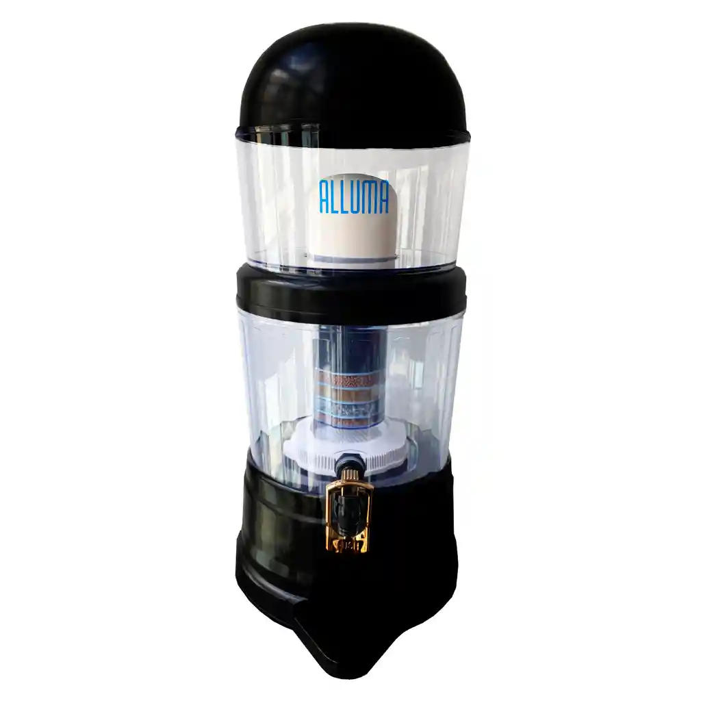 Filtro Purificador De Agua Alluma 14 Litros ====== Descripción ====== Capacidad de los Tanques: - Capacidad de tanque Superior: 5 litros - Capacidad de tanque Superior: 9 litros Dimensiones: Altura: 53cm, Ocupa un espacio de : 30 cm X 30 cm Caja filtro empacado: Medidas: 28cm X 28cm X 30cm Materiales de fabricación: Tanques de almacenamiento de agua: Polipropileno libre de BPA Demás accesorios: ABS grado alimenticio Caja de empaque: carton corrugado Contenido: Tapa superior plana, tanque superior, cerámica coreana, (empaque de silicona neutra, anillo con rosca), anillo ajustable, tanque inferior, cilindro multicapas de seis capas, disco de piedras minerales marinas (17 cm diámetro), 1 llave magnética imantada (válvula imantada, 2 empaques de silicona neutra), base. Descripción de Componentes: - Filtro de Cerámica Coreana: Retiene todos los sedimentos y las bacterias contenidas en el agua. El tamaño de los poros de filtración es de 0.2 micras (la quinta parte del tamaño de una bacteria), lo cual no permite su paso, evitando enfermedades graves Como: Cólera, Fiebre tifoidea, Disentería - Cilindro Multicapas Descripción de Componentes Para Filtrar Purificar Y Mineralizar el Agua: FIltrado de Carbón activado ( doble capa) Retira compuestos orgánicos,Olores,Colores, sabores, Cloro, detergentes y químicos indeseables. (Se realiza el proceso de filtrado por segunda vez). - Enriquecimiento con esferas Mineralizadas Las que le proveen al agua los minerales necesarios para mantener el balance del PH de los fluidos del cuerpo, facilitando su absorción por parte de las células,siendo de gran beneficio para la salud. - Filtrado con Arena Silica A través de este proceso retiran los ácidos del agua. - FIltrado de Zeolita: ALCALINIZA el agua haciéndola Liviana y Suave, este mineral libera de ACIDEZ, retirando metales pesados, como plomo, hierro, mercurio y aluminio. - Doble Capa de Cerámica Microporosa: Retención de sedimentos y cloro. - Disco de Piedras Minerales - Adición de micro elementos para completar el agua perfecta alcalina Liviana, Suave Libre de cloro y Agradable Sabor. Entre otros Oxigeno, Calcio, Potasio, Magnesio, Sodio, estos minerales son sustraídos del fondo del mara una profundidad de más de 400 metros -Llave Magnética Armoniza las moléculas del agua. Bajo la premisa de que el campo magnético de la tierra generalmente provee vitalidad y salud para el cuerpo humano, la llave dispensadora contiene en su interior un imán para alinear las moléculas del agua obteniéndose así éste beneficio. NOTA: Disponemos y garantizamos de todos los repuestos para nuestros Filtros Alluma Colombia