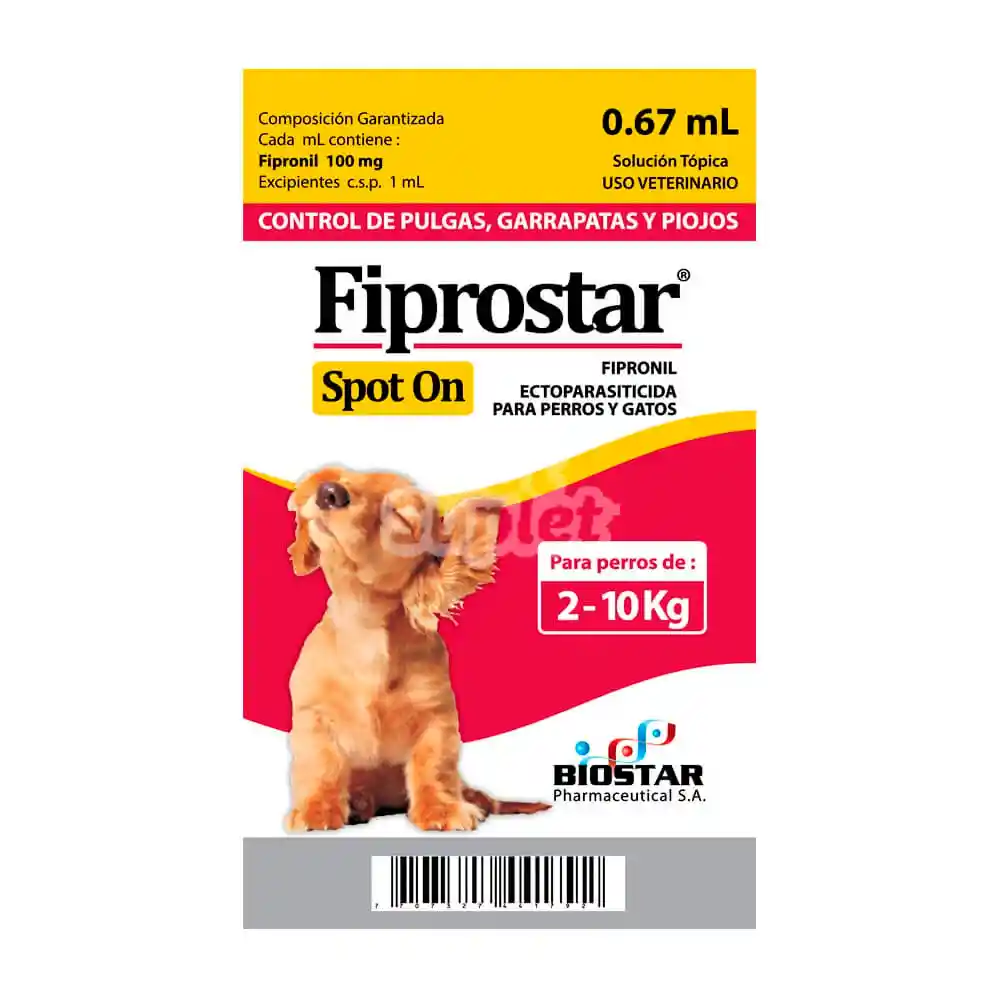 FIPROSTAR® SPOT ON es un compuesto fenilpirazólico usado como agente antiparasitario externo, para el control de pulgas, piojos, ácaros y garrapatas en perros.