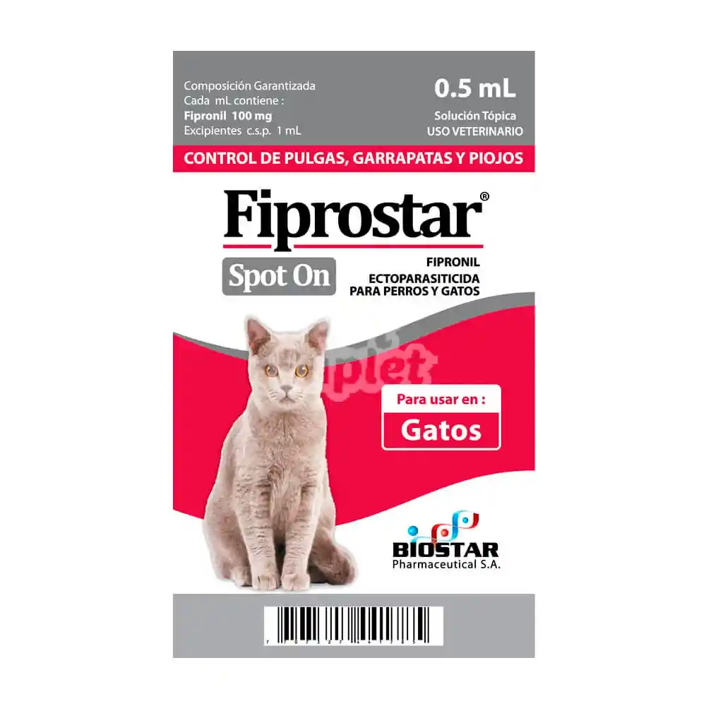 FIPROSTAR® SPOT ON es un compuesto fenilpirazólico usado como agente antiparasitario externo, para el control de pulgas, piojos, ácaros y garrapatas en gatos.