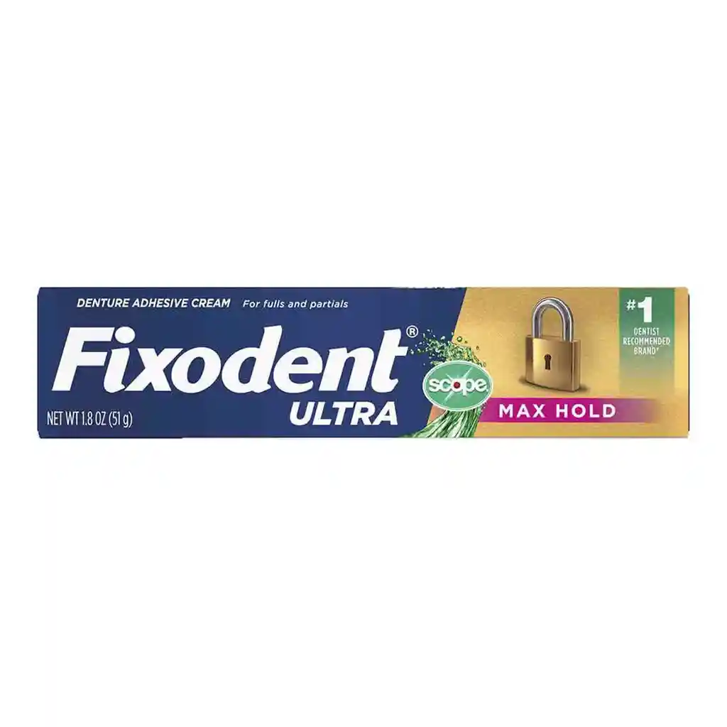 Fixodent Ultra Max Hold con Scope ofrece una fijación extra fuerte y duradera para dentaduras postizas, brindando seguridad y confianza durante todo el día. Su fórmula avanzada con Scope ayuda a mantener un aliento fresco y una sensación de limpieza prolongada. Ideal para dentaduras completas o parciales, crea una barrera hermética que evita la filtración de alimentos y mejora la comodidad bucal. Con su frescura mentolada y su tecnología de adhesión de larga duración, Fixodent Ultra Max Hold protege las encías, mejora la experiencia al masticar y favorece la salud oral diaria.