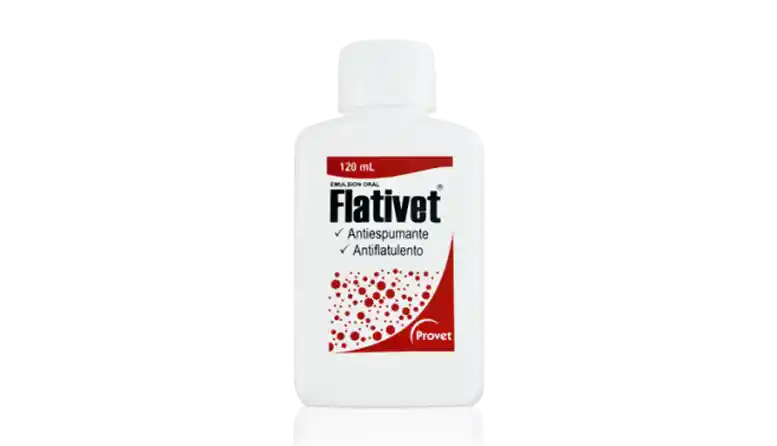 Descripción FLATIVET. Emulsión oral. Antiflatulento y Antiespumante. Especies: Bovinos, Caninos, Caprinos, Equinos, Ovinos. Presentación: 120 ml. USO EN TODAS LAS ESPECIES Emulsión oral. Antiflatulento y Antiespumante COMPOSICIÓN: Cada 100 ml. de FLATIVET contiene: Dimetil-Polisiloxano USP 30 g MECANISMO DE ACCIÓN: El dimetil-polisiloxano (Simeticona) reduce la tensión superficial de la burbuja gaseosa, permitiendo la expulsión de los gases gástricos e intestinales y la recuperación rápida del animal. INDICACIONES: FLATIVET está especialmente indicado en los procesos de timpanismo o meteorismo, principalmente debidos a la ingestión de forraje verde recalentado, muy tierno o fermentado. Gracias a su acción lubricante, en caninos y felinos es útil para prevenir y tratar problemas de gases como flatulencia y timpanismo canino; de esta forma previene la presentación de torsiones y vólvulos gástricos. Favorece el vaciado del tracto gastrointestinal como preparación para una cirugía en cavidad abdominal. En casos de obstrucción por impactación de la materia fecal en el intestino, favorece el transito intestinal (por lubricación y no por efecto laxante). En gastroenteritis severas actúa como lubricante del lúmen intestinal, disminuyendo la fricción y el desprendimiento de la mucosa, creando una película que a su vez disminuye la absorción de las enterotoxinas bacterianas. VENTAJAS BENEFICIOS: No se absorbe y es eliminado en las heces. Permanece en la luz intestinal generando su efecto terapéutico y lo que le confiriere también excelente margen de seguridad. No tiene tiempo de retiro DOSIS Y ADMINISTRACION: Vía oral previa dilución en 250 mL de agua administrar: Bovinos y equinos: 40 mL / 100 Kg de peso Ovinos y caprinos: 20 mL / 50 Kg de peso Caninos: 5-10 mL según tamaño, sin diluir Se recomienda suministrar dos tomas diarias, pero en todos los casos, impera el criterio del Médico Veterinario. TIEMPO DE RETIRO: No tiene debido a que el producto no se absorbe a nivel gastrointestinal. PRESENTACION: Frasco por 120 mL