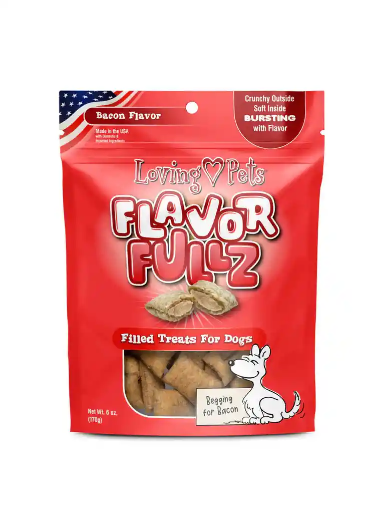 Dale a tu mejor amigo una explosión de sabor con Flavorfullz Bacon, golosinas premium Crujiente exterior + centro suave y jugoso con auténtico sabor a tocino, solo ingredientes de calidad, sin trigo, maíz, soja, colorantes ni sabores artificiales. Perfectas para premiar durante el entrenamiento o simplemente consentir