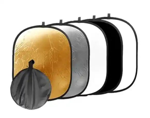 CONTENIDO DEL PAQUETE:1 * Reflector (5 en 1) 90cm*120cm1* bolsa de transporteSKU: 525Características:El cinco-en-uno portátil reflector kit elimina la necesidad de múltiples reflectores, sedas y sólidos. El reflector es un peso ligero, oval, sistema reflector de estructura de acero que se pliega convenientemente alrededor de un tercio de su tamaño en uso para facilitar su transporte y almacenamiento. A diferencia de los reflectores convencionales, sin embargo, cuenta con una extraíble cubierta reversible que permite cinco superficies excepcionalmente funcionales.Reflector de fotografía oval de 90cm * 120cmReflector de luz retráctil multidisco 5 en 1Tamaño abierto: 90cm * 120cmLa interfaz total de 5 colores elige libremente: dorado, plateado, translúcido, blanco y negroEsos son el reflector más popular en fotografía.Viene con un práctico estuche de almacenamiento para que pueda llevarlo a donde quieraEs una necesidad para la fotografía de estudio o al aire libre.Se puede doblar en una bolsa de transporte fácil.5 colores:Plata- para contraste y aumento de reflejosOro: consigue tonos de piel cálidos y brillantesNegro: bloquea la luz no deseadaBlanco: produce una temperatura de color neutraTranslúcido, para una apariencia más suave sin sombrasSuperficies: Oro, plata, blanco, negro y Transparente.Forma: OvalTamaño: Aprox. 90cm * 120cmEstilo: reflector de luz estudio fotográficoPara: estudio fotográfico portátil
