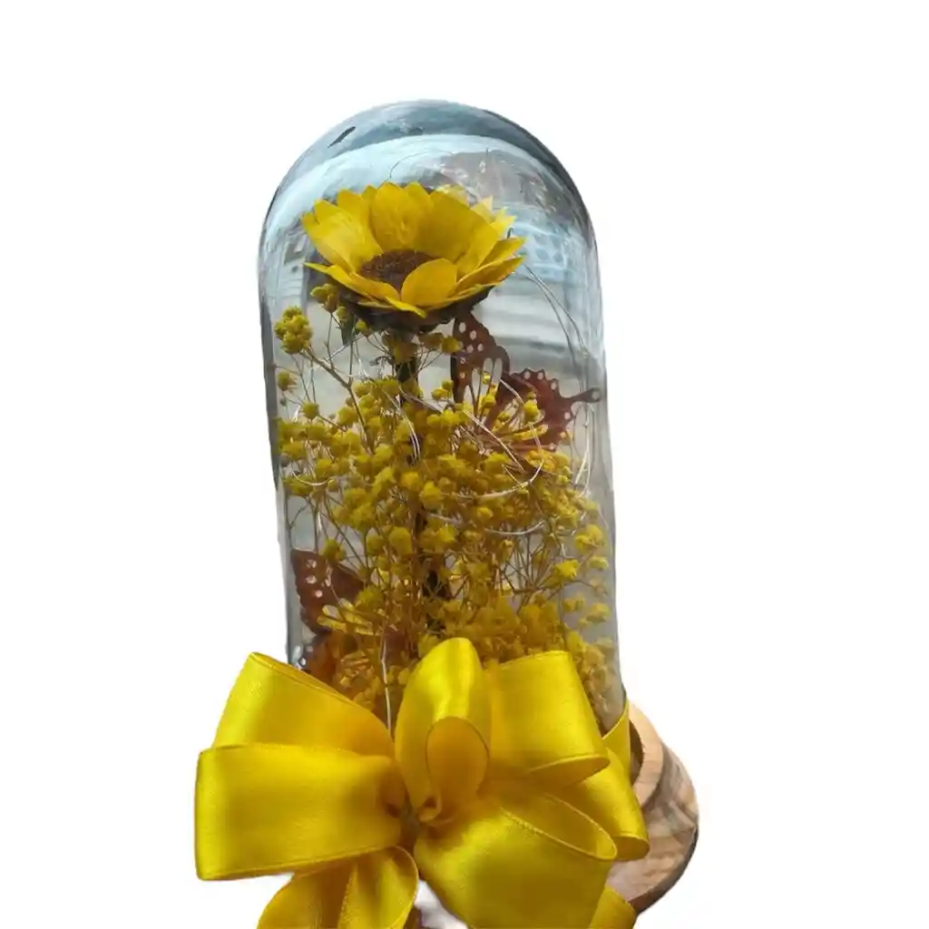Un girasol sobre base de madera encapsulado en vidrio es una pieza decorativa que combina la belleza natural de una flor con un toque moderno. El girasol, tallado o conservado de manera realista, se encuentra montado sobre una base de madera, mientras que todo el conjunto está protegido por un elegante revestimiento de vidrio transparente que resalta su colorido y detalles, ofreciendo una sensación de delicadeza.